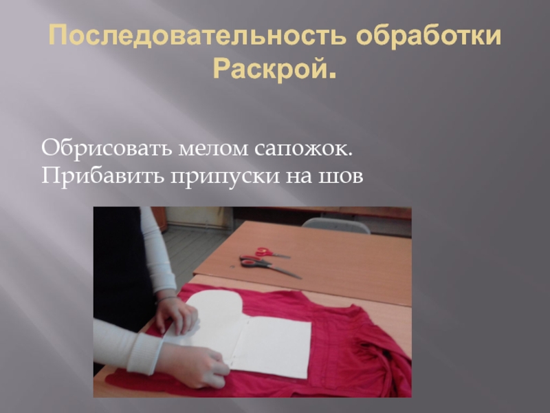 Последовательность обработки Раскрой.Обрисовать мелом сапожок.Прибавить припуски на шов