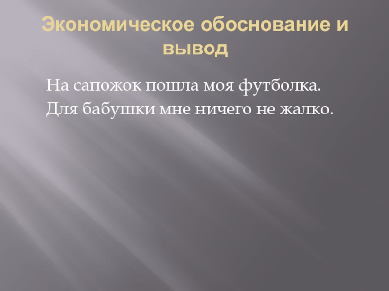 Экономическое обоснование и выводНа сапожок пошла моя футболка.Для бабушки мне ничего не жалко.