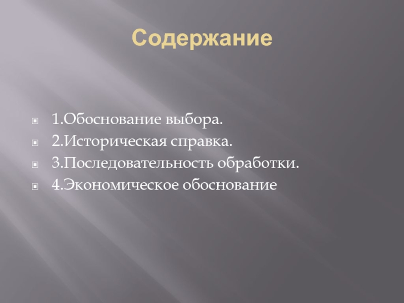 Содержание1.Обоснование выбора.2.Историческая справка.3.Последовательность обработки.4.Экономическое обоснование