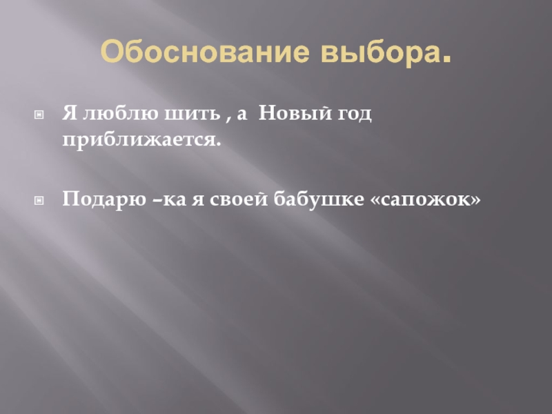 Обоснование выбора.Я люблю шить , а Новый год приближается.Подарю –ка я своей бабушке «сапожок»