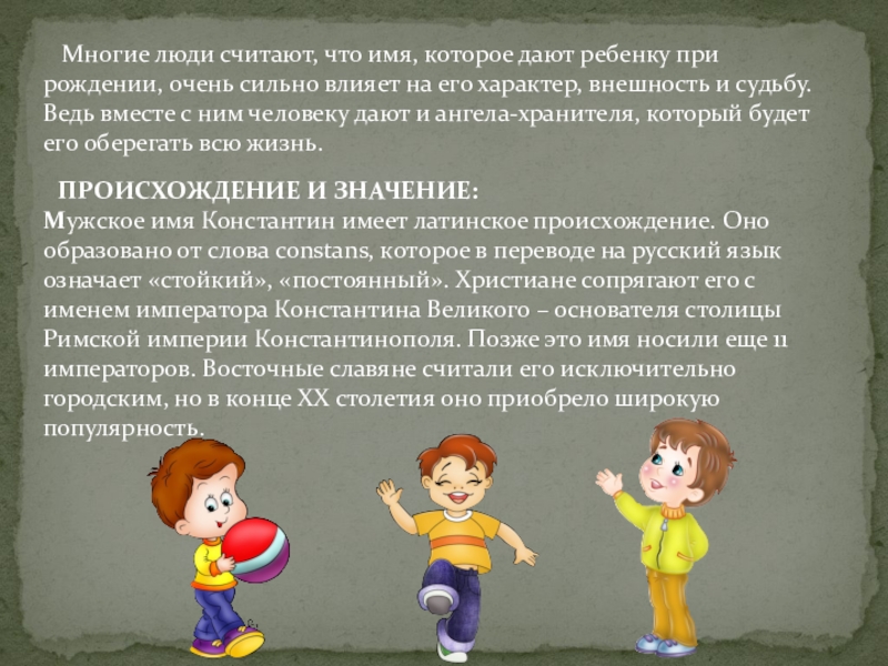 имя, которое дают ребенку при рождении, очень сильно влияет на его характер, внешность и судьбу. Ведь вместе с ним человеку дают и ангела-хранителя, который будет его оберегать всю жизнь. ПРОИСХОЖДЕНИЕ И ЗНАЧЕНИЕ: Мужское имя Константин имеет латинское происхождение. Оно образовано от слова constans, которое в переводе на русский язык означает «стойкий», «постоянный». Христиане сопрягают его с именем императора Константина Великого – основателя столицы Римской империи Константинополя. Позже это имя носили еще 11 императоров. Восточные славяне считали его исключительно городским, но в конце ХХ столетия оно приобрело широкую популярность.
