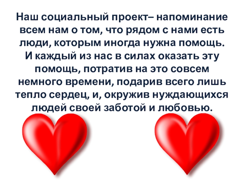 нами есть люди, которым иногда нужна помощь. И каждый из нас в силах оказать эту помощь, потратив на это совсем немного времени, подарив всего лишь тепло сердец, и, окружив нуждающихся людей своей заботой и любовью.
