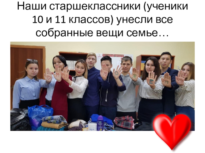 Слайд 9Наши старшеклассники (ученики 10 и 11 классов) унесли все собранные вещи