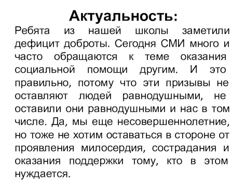 часто обращаются к теме оказания социальной помощи другим. И это правильно, потому что эти призывы не оставляют людей равнодушными, не оставили они равнодушными и нас в том числе. Да, мы еще несовершеннолетние, но тоже не хотим оставаться в стороне от проявления милосердия, сострадания и оказания поддержки тому, кто в этом нуждается.