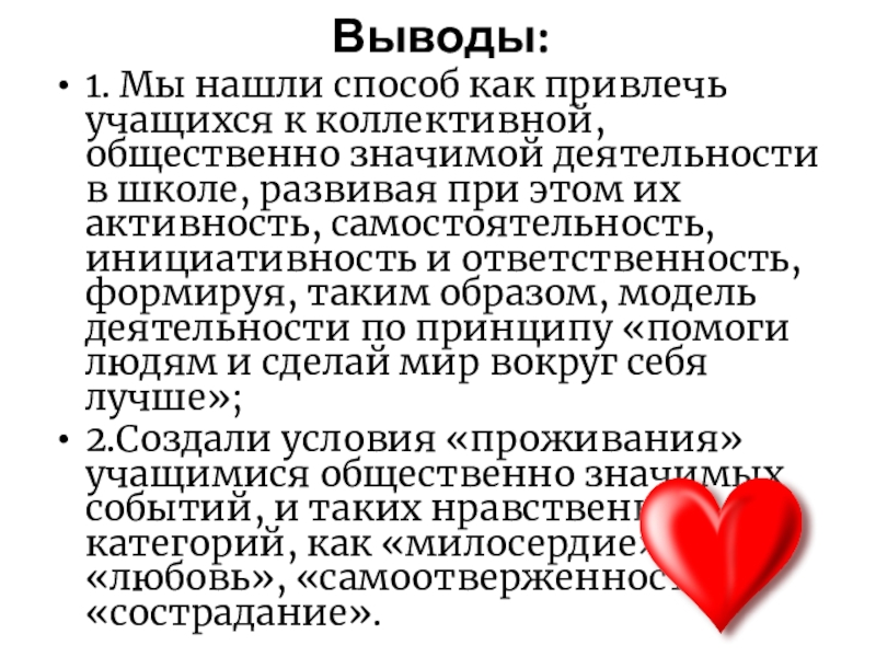 2.Создали условия «проживания» учащимися общественно значимых событий, и таких нравственных категорий, как «милосердие», «любовь», «самоотверженность», «сострадание».