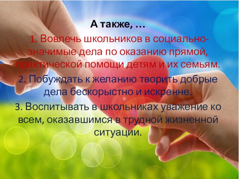2. Побуждать к желанию творить добрые дела бескорыстно и искренне.