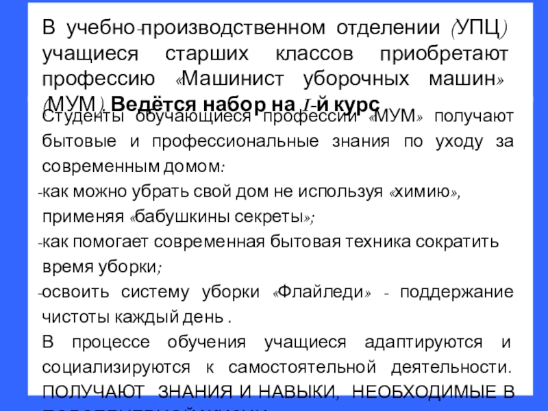 Студенты обучающиеся профессии «МУМ» получают бытовые и профессиональные знания по уходу за современным домом: