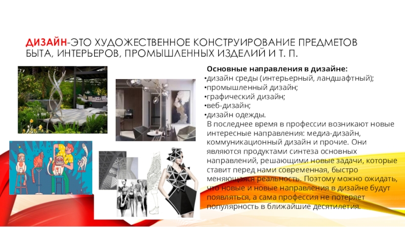 В последнее время в профессии возникают новые интересные направления: медиа-дизайн, коммуникационный дизайн и прочие. Они являются продуктами синтеза основных направлений, решающими новые задачи, которые ставит перед нами современная, быстро меняющаяся реальность. Поэтому можно ожидать, что новые и новые направления в дизайне будут появляться, а сама профессия не потеряет популярность в ближайшие десятилетия.