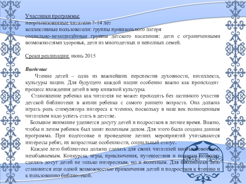 Цель — организация летнего досуга детей и подростков; повышение роли книги и чтения в нравственном и патриотическом воспитании ребенка.