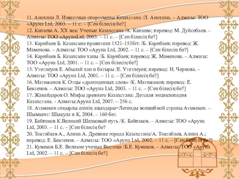 14. Карибаев Б. Казахские ханы /Б. Карибаев; перевод: Ж. Маменова. – Алматы: ТОО «Аруна Ltd, 2001. – 11 с. – [Сен білесің бе?]