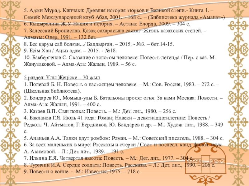 9. Турысбек Р. «Бес арыс»: Казахские поэты-писатели /Р. Турысбек; перевод: Ж. Маменова. – Алматы: ТОО «Аруна Ltd, 2002. – 11 с. – [Сен білесің бе?]