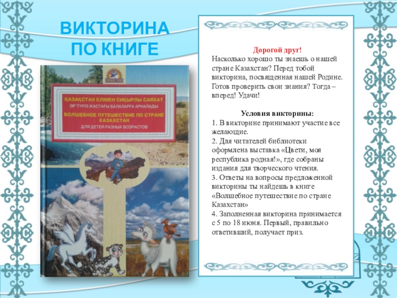 Викторина по книге «Волшебное путешествие по стране Казахстан». Брошюра с вопросами дается всем желающим, которые могут ответить в течение указанной даты летнего чтения.