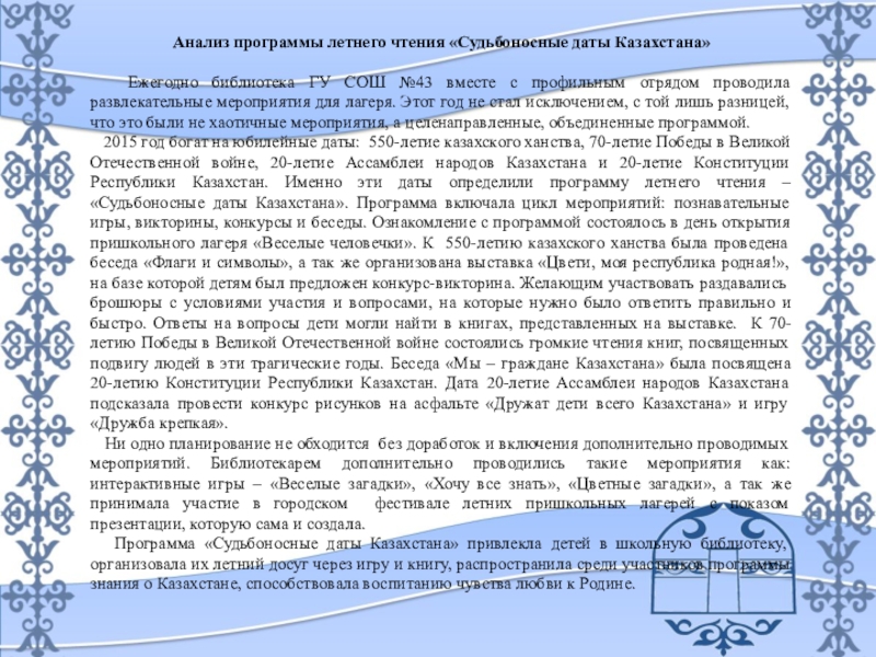 Слайд 27Анализ программы летнего чтения «Судьбоносные даты Казахстана»
