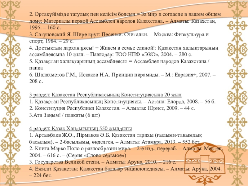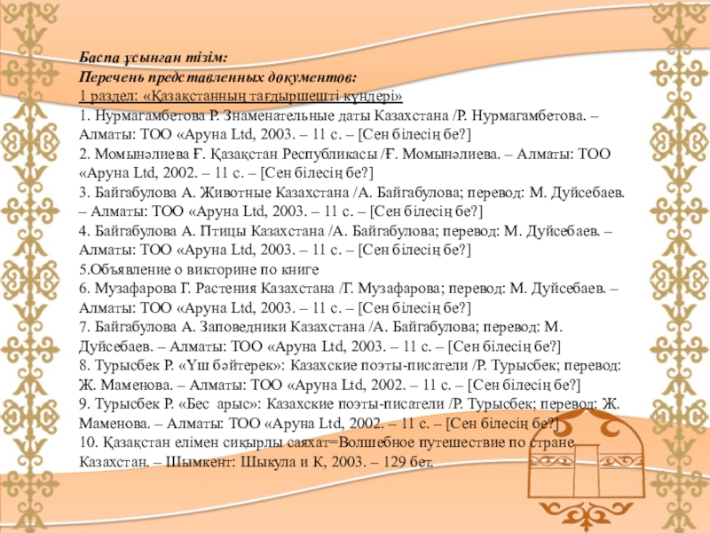 2. Момынәлиева Ғ. Қазақстан Республикасы /Ғ. Момынәлиева. – Алматы: ТОО «Аруна Ltd, 2002. – 11 с. – [Сен білесің бе?]