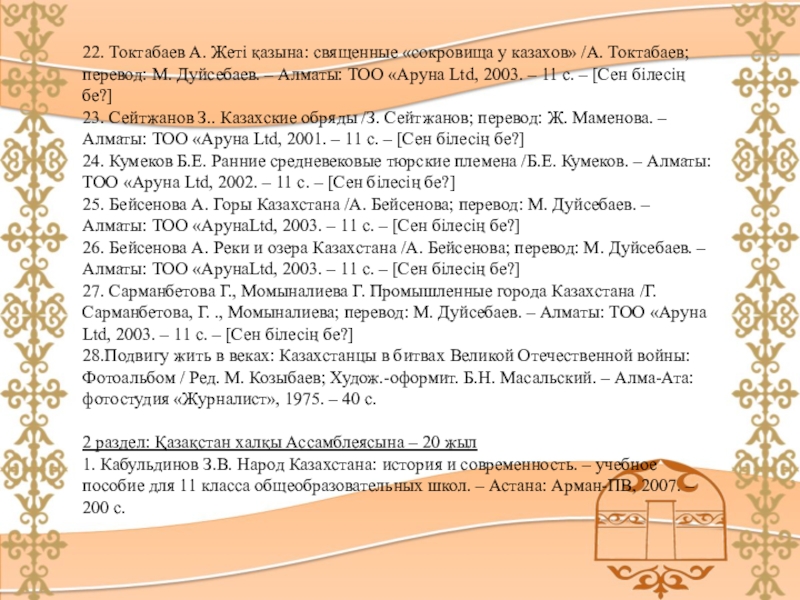 Слайд 1422. Токтабаев А. Жеті қазына: священные «сокровища у казахов» /А. Токтабаев;