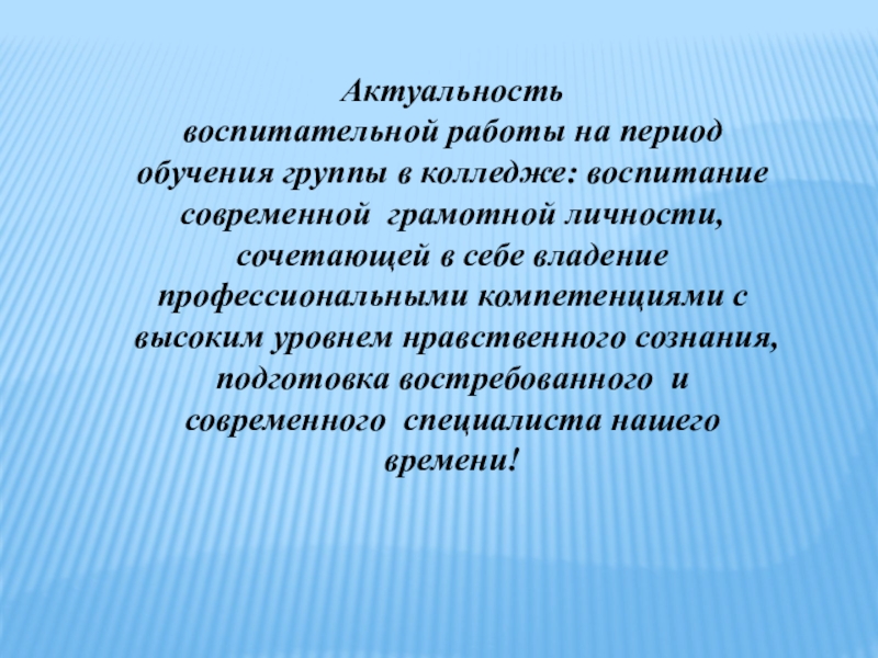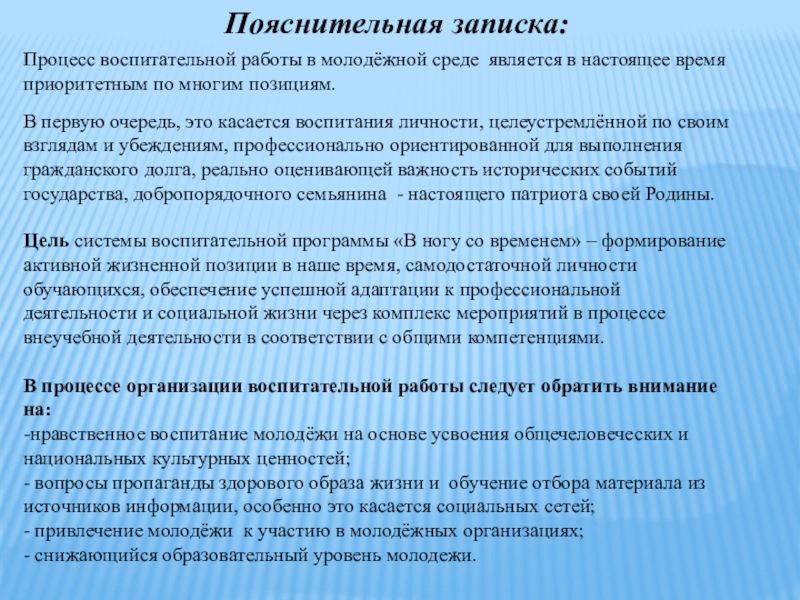 Процесс воспитательной работы в молодёжной среде является в настоящее время приоритетным по многим позициям.