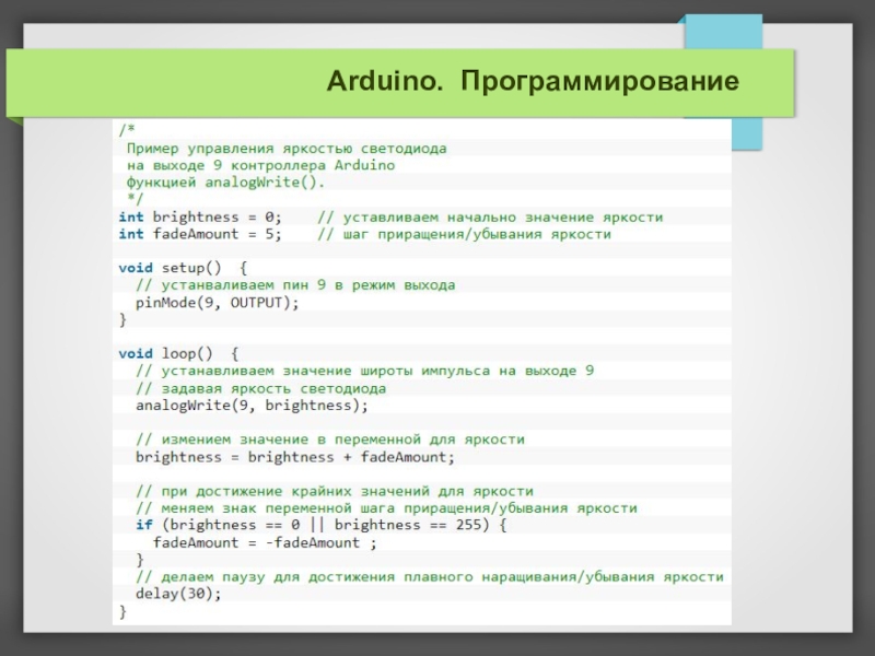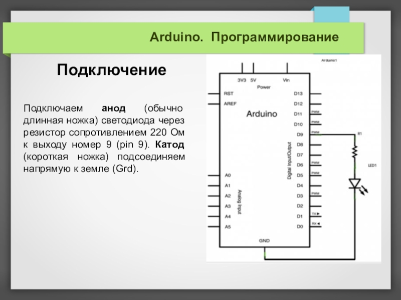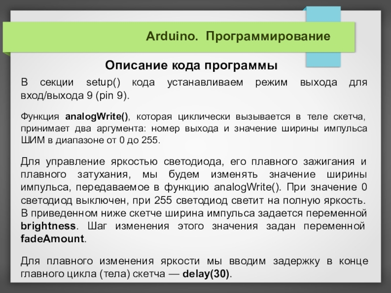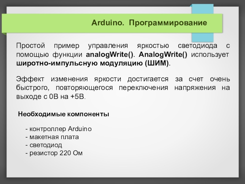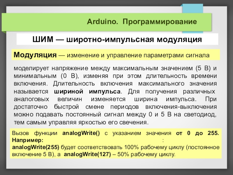 моделирует напряжение между максимальным значением (5 В) и минимальным (0 В), изменяя при этом длительность времени включения. Длительность включения максимального значения называется шириной импульса. Для получения различных аналоговых величин изменяется ширина импульса. При достаточно быстрой смене периодов включения-выключения можно подавать постоянный сигнал между 0 и 5 В на светодиод, тем самым управляя яркостью его свечения.