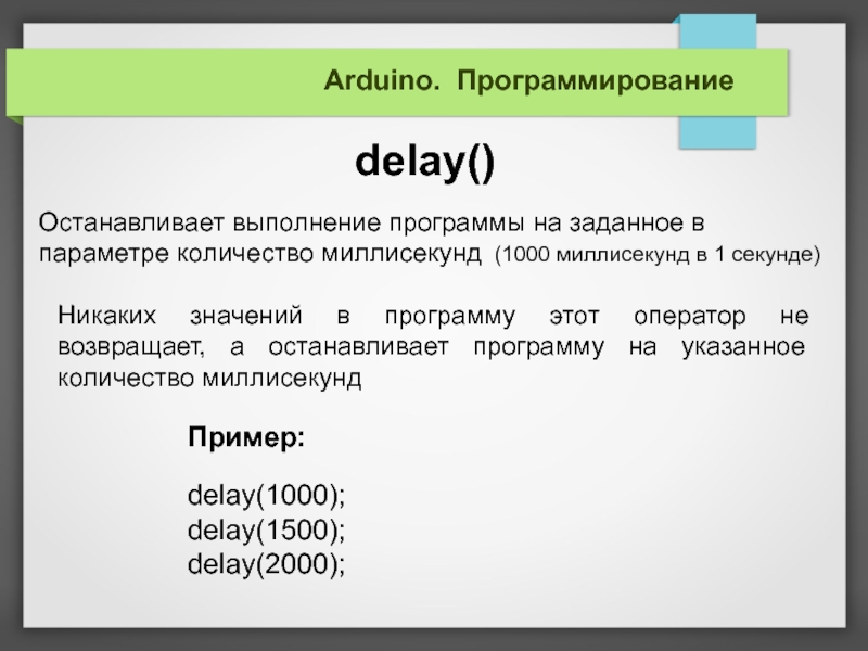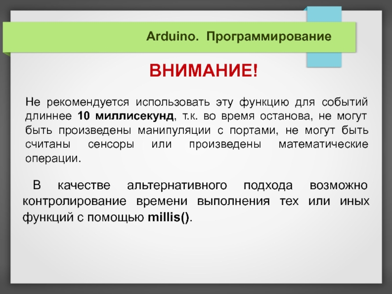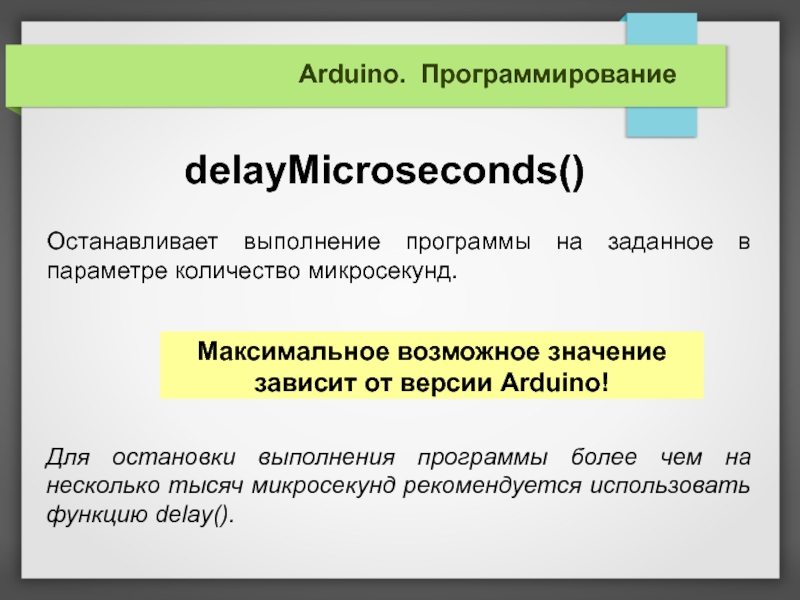Для остановки выполнения программы более чем на несколько тысяч микросекунд рекомендуется использовать функцию delay().