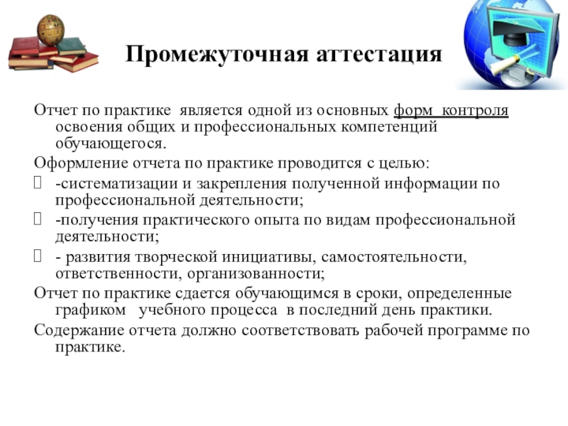 По результатам практики руководителями практики от организации и от образовательной организации формируется аттестационный лист, содержащий сведения об уровне освоения обучающимся профессиональных компетенций, а также характеристика на обучающегося по освоению профессиональных компетенций в период прохождения практики. В период прохождения практики обучающимся ведется дневник практики. По результатам практики обучающимся составляется отчет, который утверждается организацией.