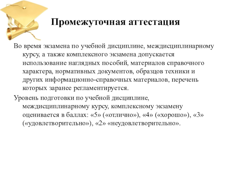 Уровень подготовки по учебной дисциплине, междисциплинарному курсу, комплексному экзамену оценивается в баллах: «5» («отлично»), «4» («хорошо»), «3» («удовлетворительно»), «2» «неудовлетворительно».