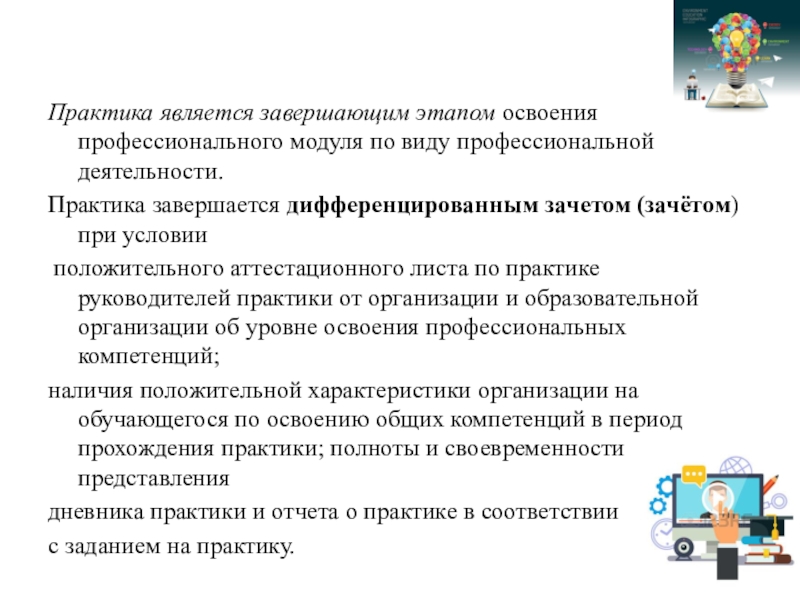 Слайд 13Практика является завершающим этапом освоения профессионального модуля по виду профессиональной деятельности.