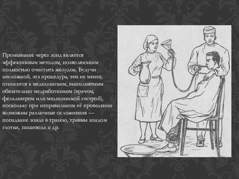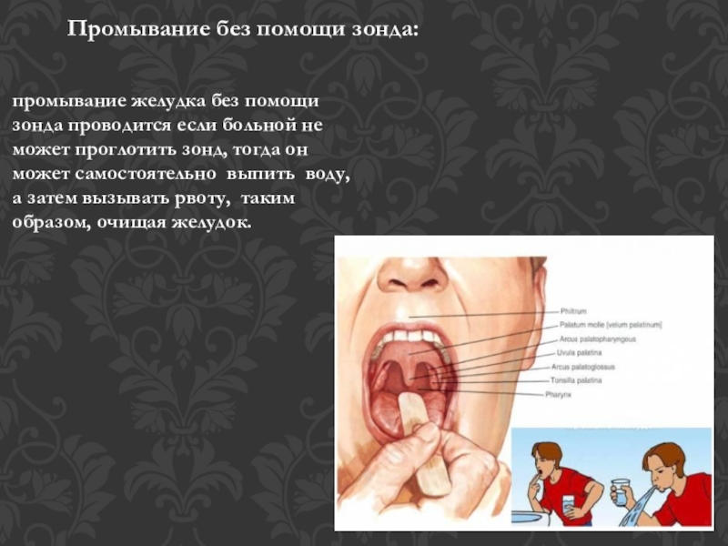 •Сопорозное или бессознательное состояние пациента при невозможности интубации трахеи (промывание желудка откладывается до стационара).