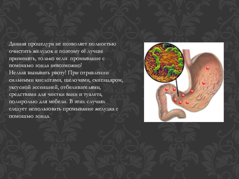 •Недостаточность кровообращения и дыхания в стадии декомпенсации (промывание желудка откладывается до момента улучшения ситуации).