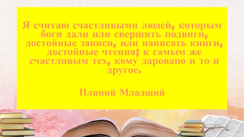 Я считаю счастливыми людей, которым боги дали или свершить подвиги, достойные записи, или написать книги, достойные чтения; к самым же счастливым тех, кому даровано и то и другое. Плиний Младший