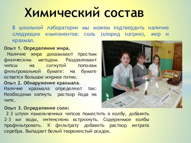 Наличие жира доказывают простым физическим методом. Раздавливают чипсы на согнутой пополам фильтровальной бумаге: на бумаге остается большое жирное пятно.