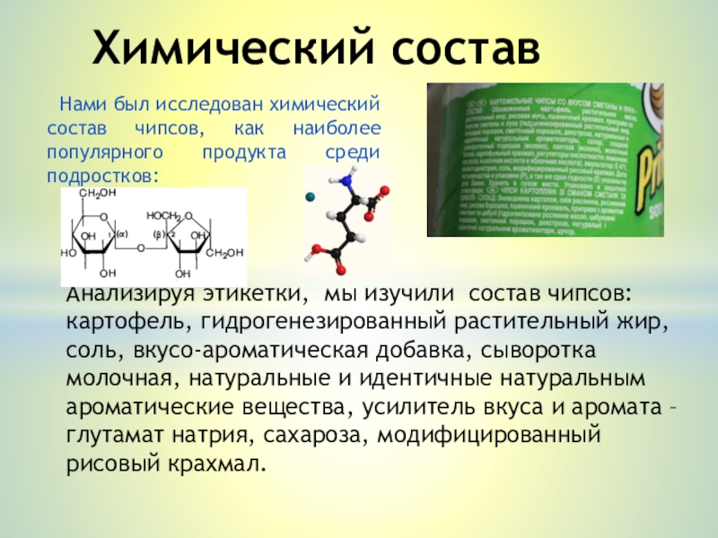 Анализируя этикетки, мы изучили состав чипсов: картофель, гидрогенезированный растительный жир, соль, вкусо-ароматическая добавка, сыворотка молочная, натуральные и идентичные натуральным ароматические вещества, усилитель вкуса и аромата – глутамат натрия, сахароза, модифицированный рисовый крахмал.