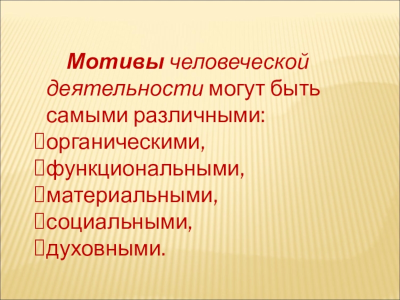 Слайд 7 Мотивы человеческой деятельности могут быть самыми различными: