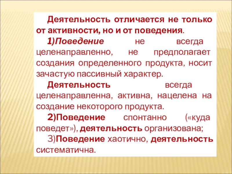 Слайд 5Деятельность отличается не только от активности, но и от поведения.