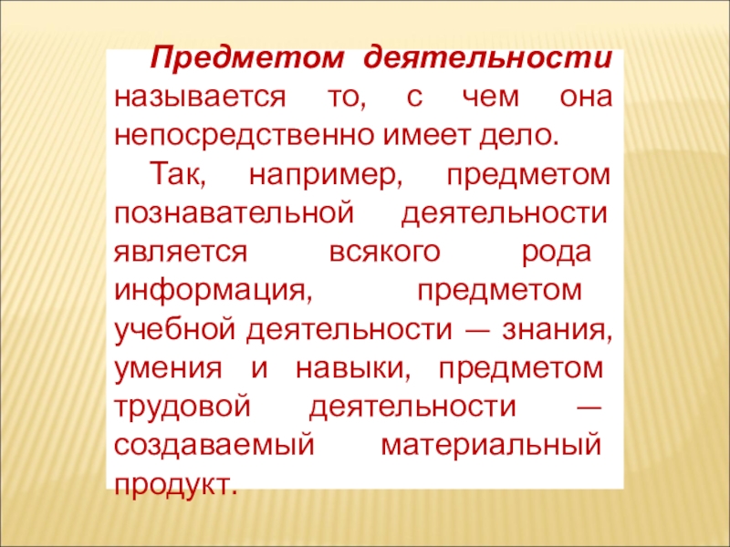 например, предметом познавательной деятельности является всякого рода информация, предметом учебной деятельности — знания, умения и навыки, предметом трудовой деятельности — создаваемый материальный продукт.