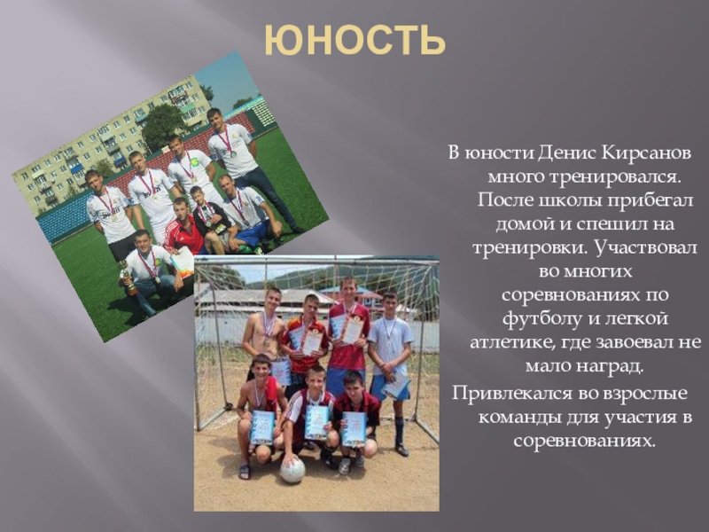 ЮНОСТЬВ юности Денис Кирсанов много тренировался. После школы прибегал домой и спешил на тренировки. Участвовал во многих