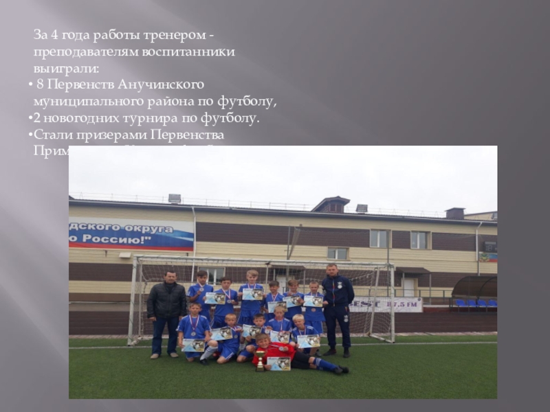 За 4 года работы тренером - преподавателям воспитанники выиграли: 8 Первенств Анучинского муниципального района по футболу,2 новогодних