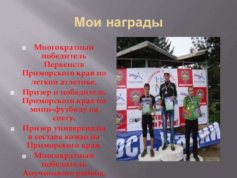 Мои награды Многократный победитель Первенств Приморского края по легкой атлетике.Призер и победитель Приморского края по мини-футболу на