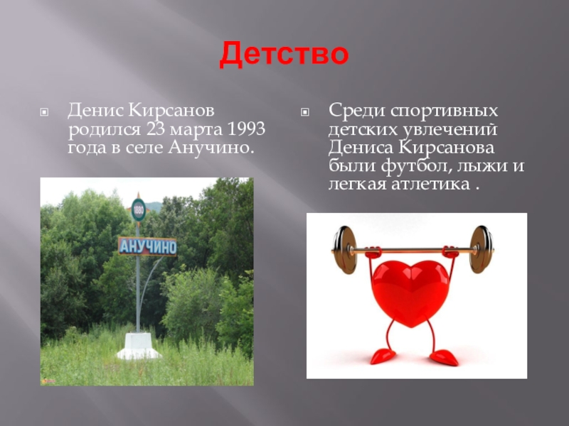 Детство Денис Кирсанов родился 23 марта 1993 года в селе Анучино.Среди спортивных детских увлечений Дениса Кирсанова были