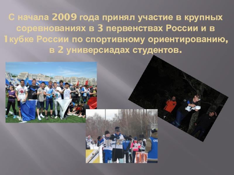 первенствах России и в 1кубке России по спортивному ориентированию, в 2 универсиадах студентов.