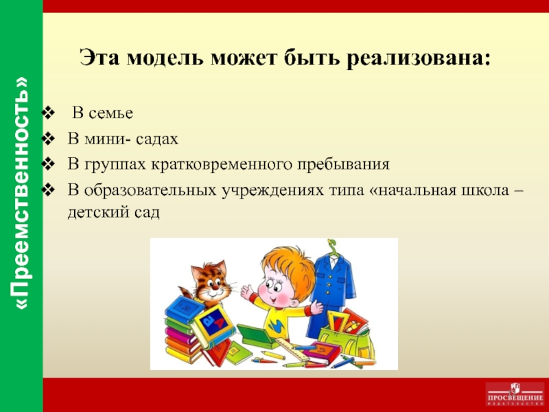 Эта модель может быть реализована: В семьеВ мини- садахВ группах кратковременного пребыванияВ образовательных учреждениях типа «начальная школа