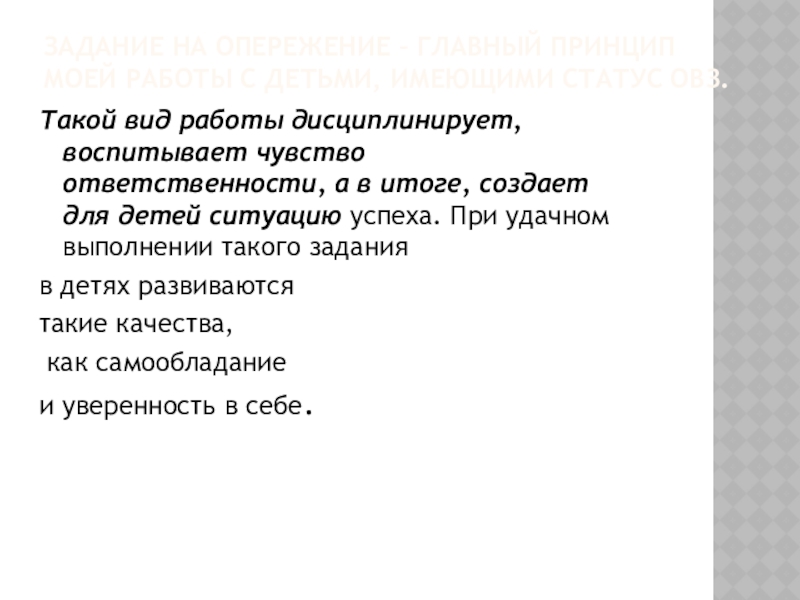 Такой вид работы дисциплинирует, воспитывает чувство ответственности, а в итоге, создает для детей ситуацию успеха. При удачном выполнении такого задания