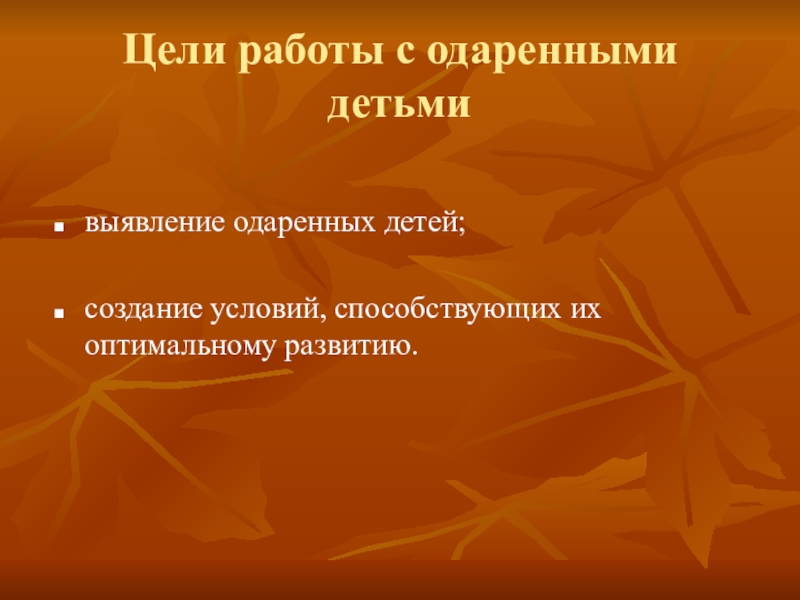 Цели работы с одаренными детьми выявление одаренных детей;создание условий, способствующих их оптимальному развитию.