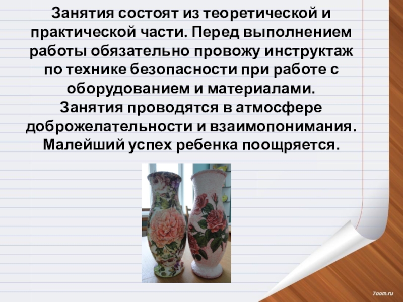 Слайд 12Занятия состоят из теоретической и практической части. Перед выполнением работы обязательно