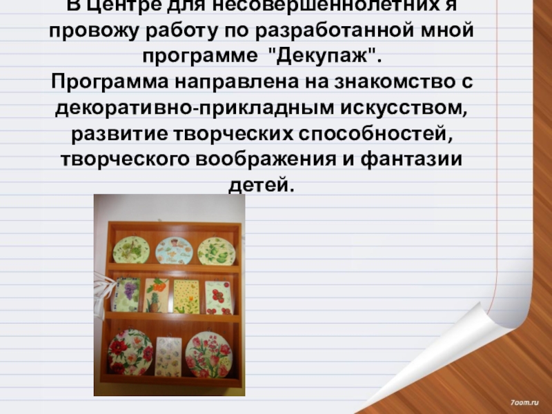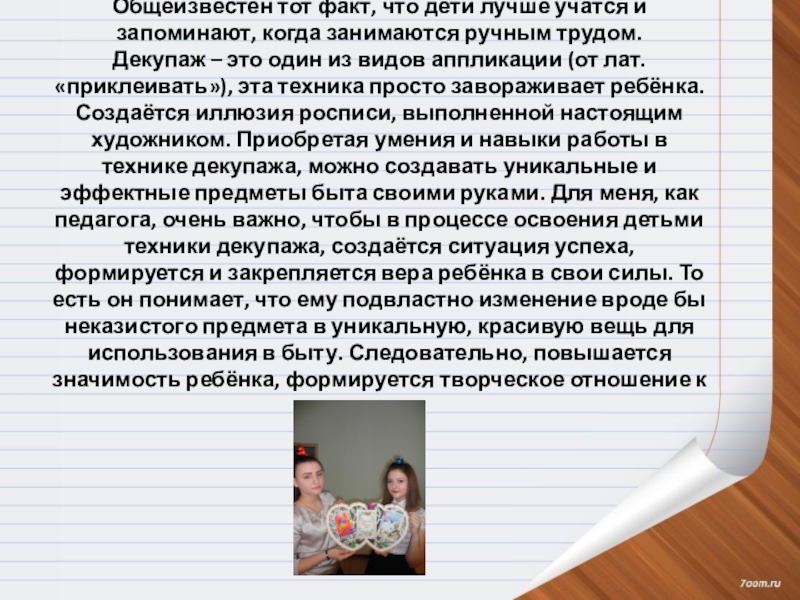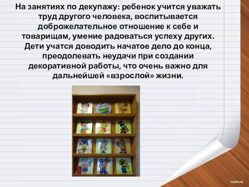 Слайд 9На занятиях по декупажу: ребенок учится уважать труд другого человека, воспитывается