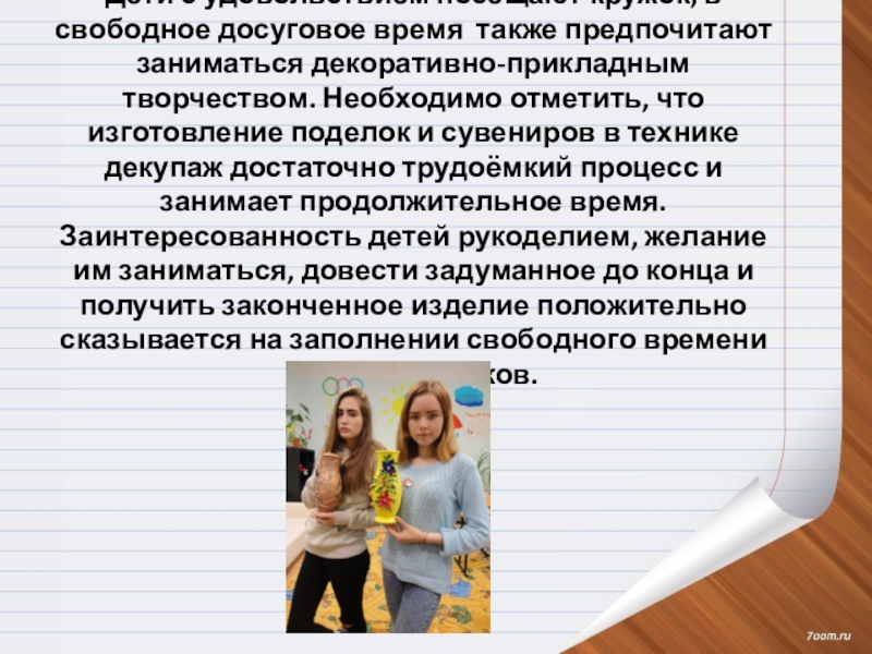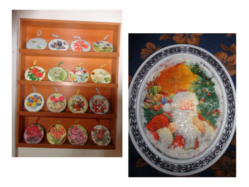 заниматься декоративно-прикладным творчеством. Необходимо отметить, что изготовление поделок и сувениров в технике декупаж достаточно трудоёмкий процесс и занимает продолжительное время. Заинтересованность детей рукоделием, желание им заниматься, довести задуманное до конца и получить законченное изделие положительно сказывается на заполнении свободного времени у воспитанников.