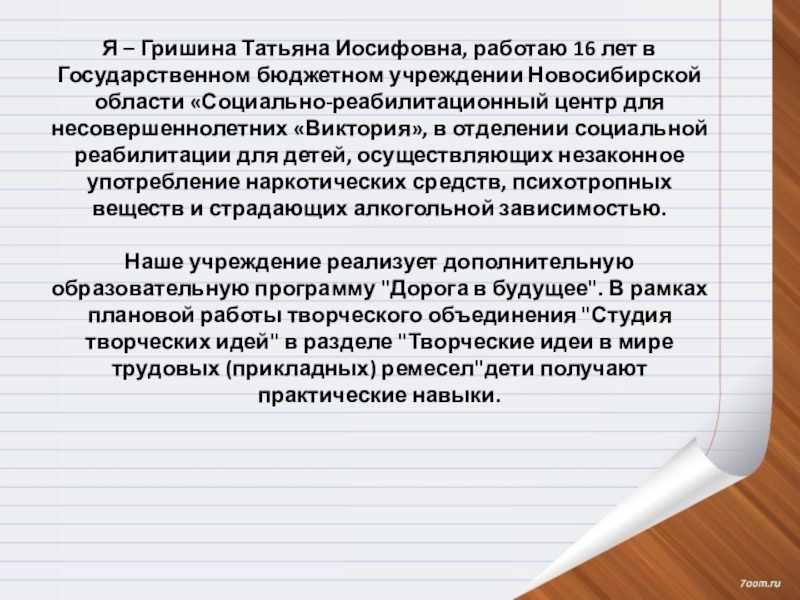 Слайд 2Я – Гришина Татьяна Иосифовна, работаю 16 лет в Государственном бюджетном
