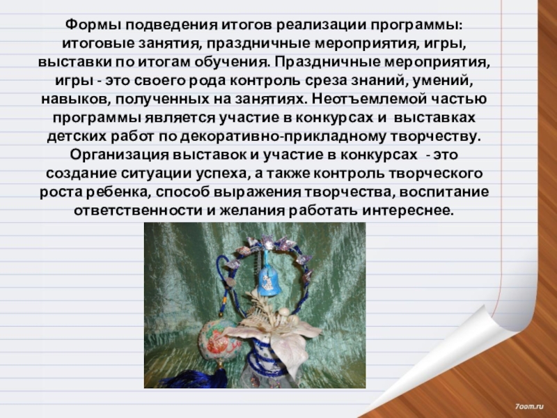 по итогам обучения. Праздничные мероприятия, игры - это своего рода контроль среза знаний, умений, навыков, полученных на занятиях. Неотъемлемой частью программы является участие в конкурсах и выставках детских работ по декоративно-прикладному творчеству.