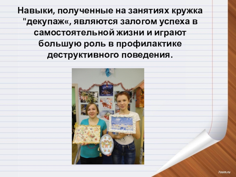 Слайд 16Навыки, полученные на занятиях кружка "декупаж«, являются залогом успеха в самостоятельной