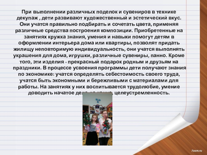 Слайд 8При выполнении различных поделок и сувениров в технике декупаж , дети