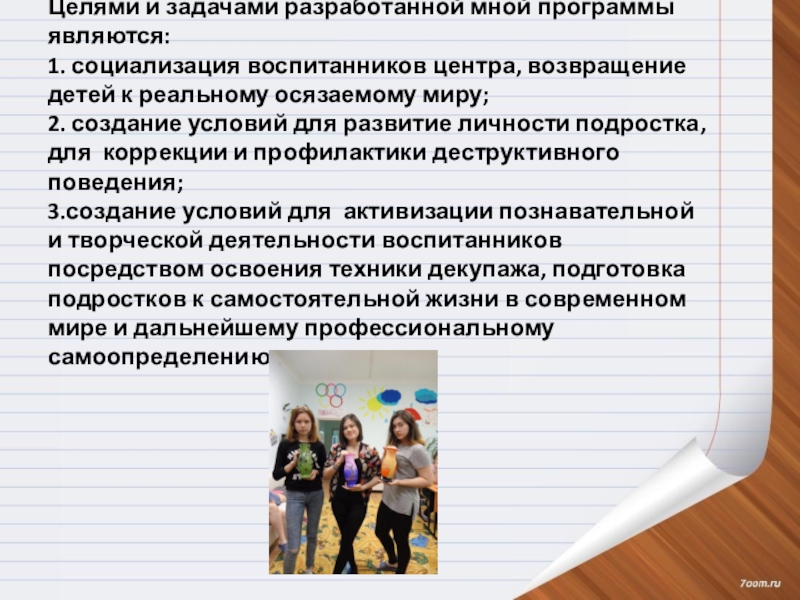 3.создание условий для активизации познавательной и творческой деятельности воспитанников посредством освоения техники декупажа, подготовка подростков к самостоятельной жизни в современном мире и дальнейшему профессиональному самоопределению.