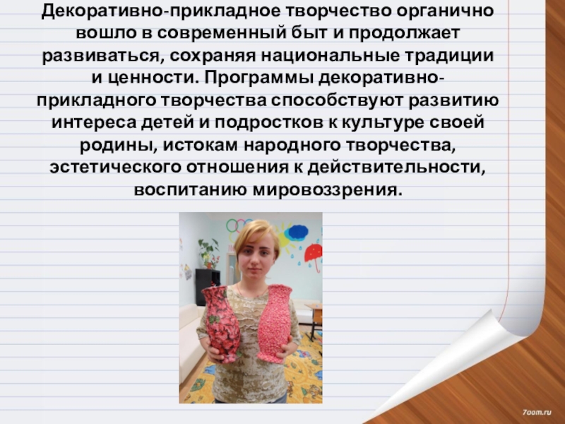 Слайд 6Декоративно-прикладное творчество органично вошло в современный быт и продолжает развиваться, сохраняя